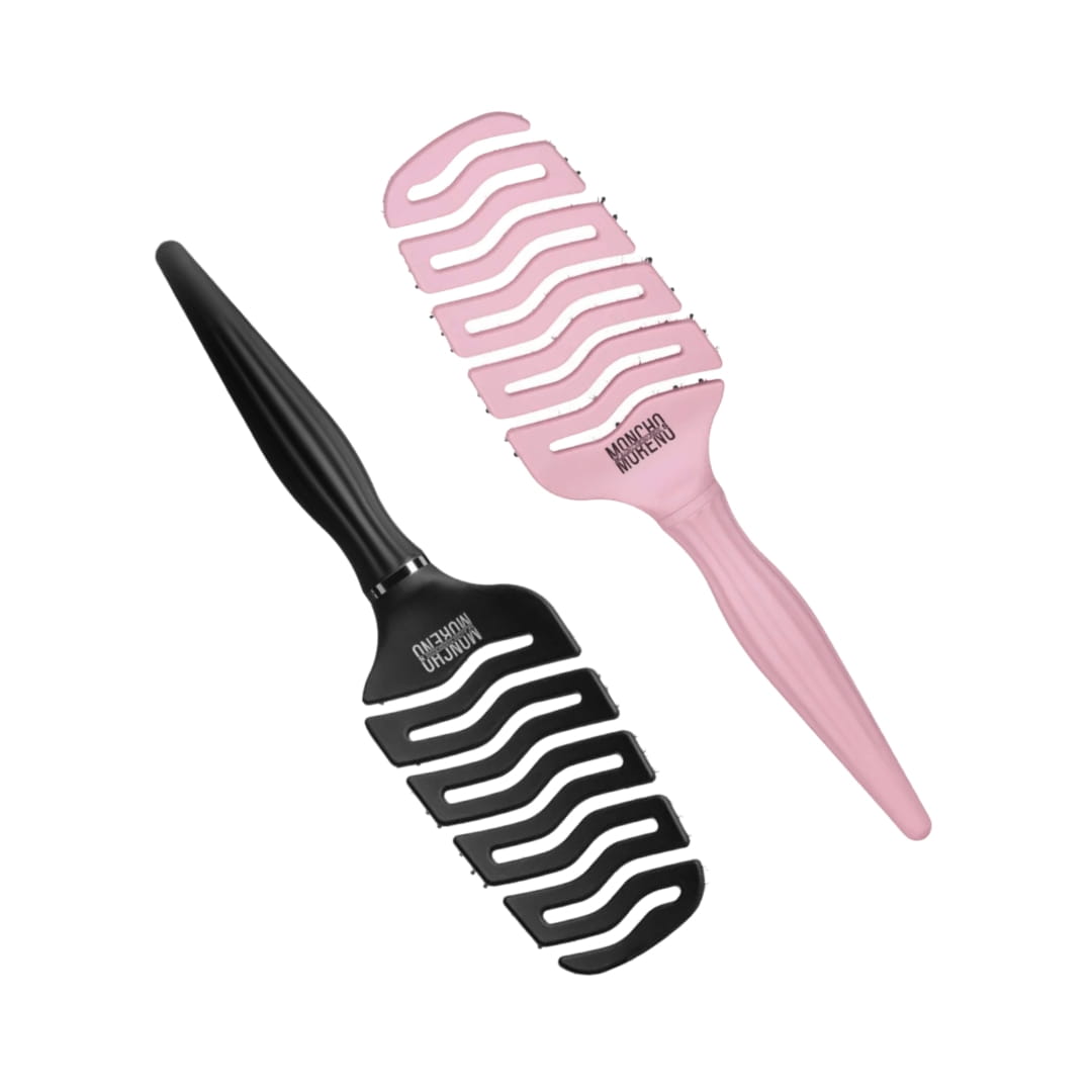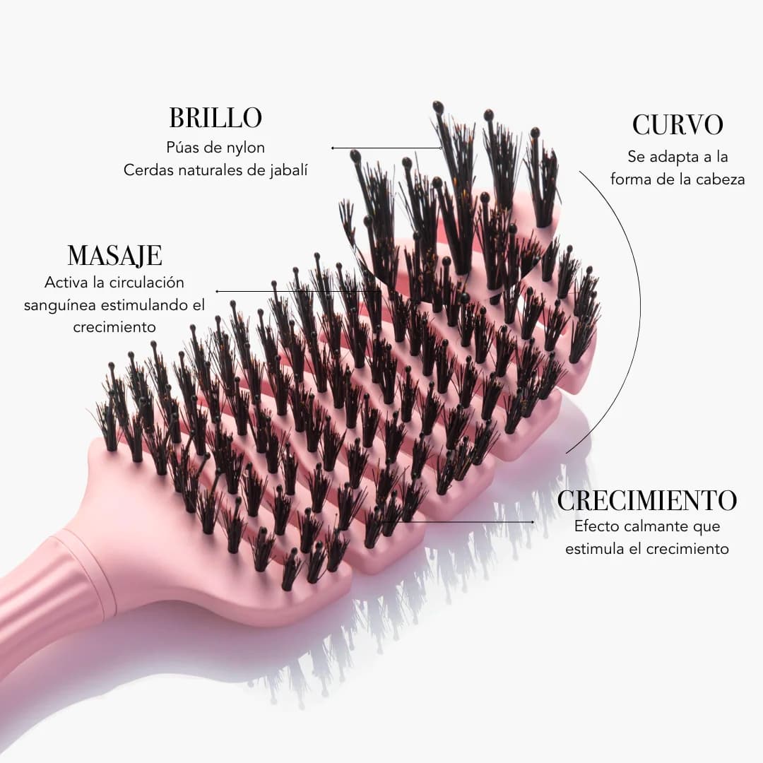 Cepillo de estructura curvada en color negro, flexible y ventilada diseñado según la forma de la cabeza para masajear el cuero cabelludo y activar la circulación sanguínea con una combinación perfecta de púas naturales de jabalí y púas sintéticas que evita roturas del cabello mientras desenreda sin dar tirones.