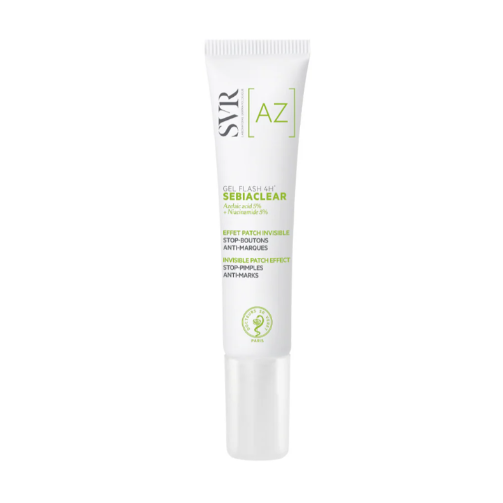 Gel invisible de efecto parche localizado con un 5% de ácido azelaico y un 5% de niacinamida. Eficaz contra las imperfecciones desde las 4 horas¹, ha sido formulado para pieles mixtas a grasas, incluso sensibles. Sebiaclear Gel Flash 4h reduce las imperfecciones y rojeces, y previene la aparición de marcas post-lesión. Su tecnología gel efecto parche forma una película oclusiva invisible que protege la piel de agresiones y del rascado. Formato práctico para reaplicaciones cómodas a lo largo del día.